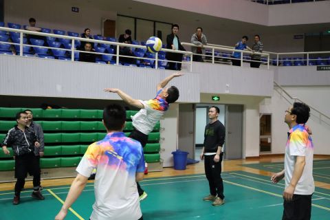 晚上六点三十分,学院男子组率先开赛,对阵马克思主义学院。36365线路检测中心五位队员配合默契,一传和二传衔接良好,石永军老师几个扣杀连续得分。对手也不甘示弱,快速组织反击,双方打得有来有回,为观众呈现了一场精彩比赛。最终,男子组首场以0:2惜败。第二场比赛在8点开始,对战金融学院。上一届比赛中双方已有交手,对各自打法均有一定了解。男队针对性开展排兵布阵,调整站位。双方经过短暂试探后立即展开激烈对垒,互有杀球和拦截,精彩比赛引得现场观众欢呼连连。战至第三场,双方比分依然胶着,最终决胜局我方以1分之差落败。