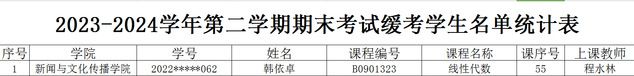 根据教务部《关于做好2023-2024学年第二学期期末考核相关工作的通知》要求,经学生个人申请,学院审核,现将缓考结果公示如下: