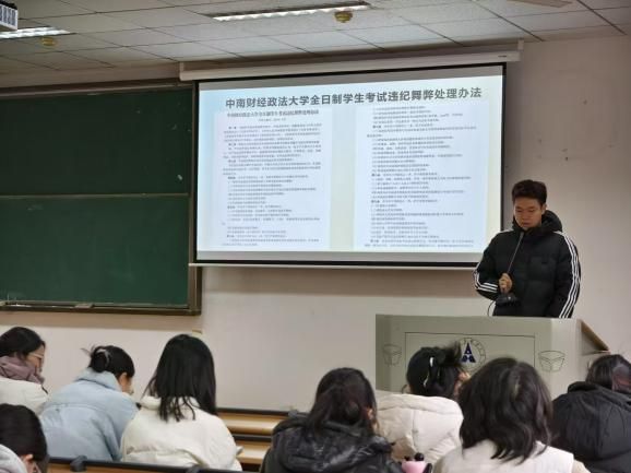 之后,张宸浩带领同学们再次学习了《中南财经政法大学全日制学生考试违纪舞弊处理办法》。张老师着重强调严防作弊,诚信应考的重要性。考试是对学生知识和品德的双重考验,要求同学们严格遵守考试纪律,树立诚实守信的价值观,以真实水平展现自己的学习成果。